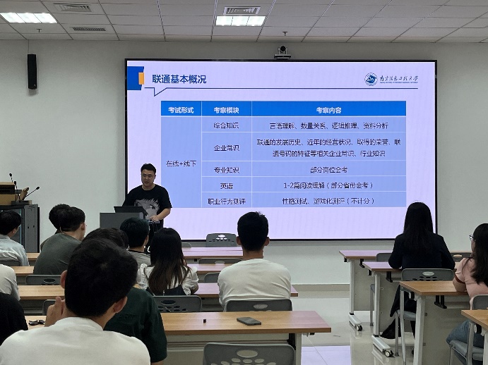 马海兰同学按照时间顺序介绍自己的求职过程,她就简历制作、笔试内容和面试技巧作出分享,并指出在简历制作中要突出与所报岗位契合度较高的技能,她向同学们介绍了笔试题型分布以及复习方法,提醒同学们面试环节应注意仪容仪表问题。目前马海兰同学已获得中国联通、中国移动等offer。