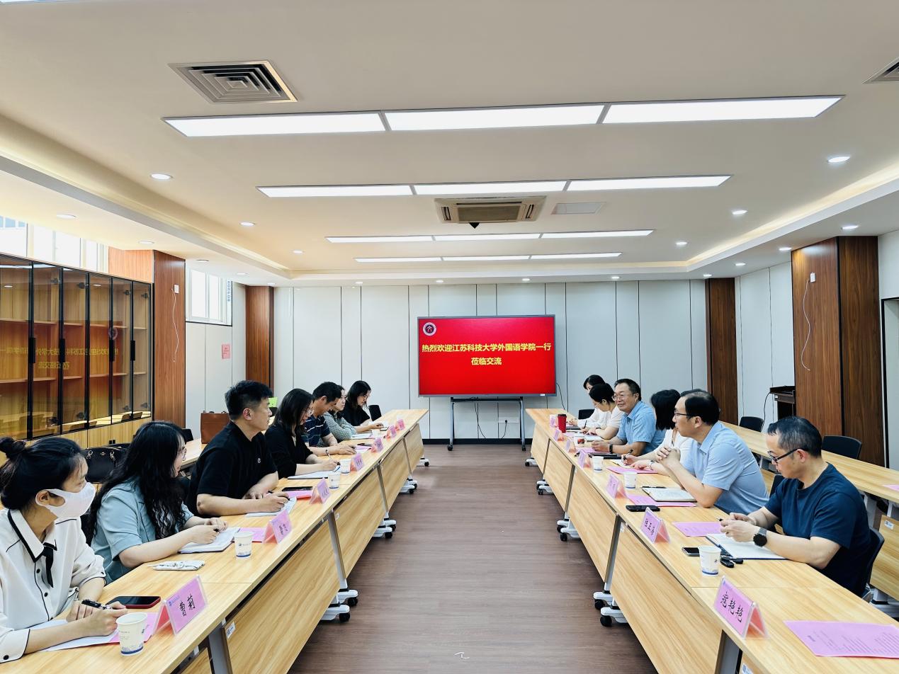 6月14日下午,江苏科技大学外国语学院一行赴文学院开展调研交流活动,交流会在文德楼N402举行。江苏科技大学外国语学院院长曾景婷、党委书记姚双良、副院长周树军和大学英语部部分老师,我校文学院院长赵霞、党委副书记(主持工作)郭雨、副院长郑友奇和公共英语教学部党支部教师党员代表参与交流活动,活动由文学院副院长郑友奇主持。