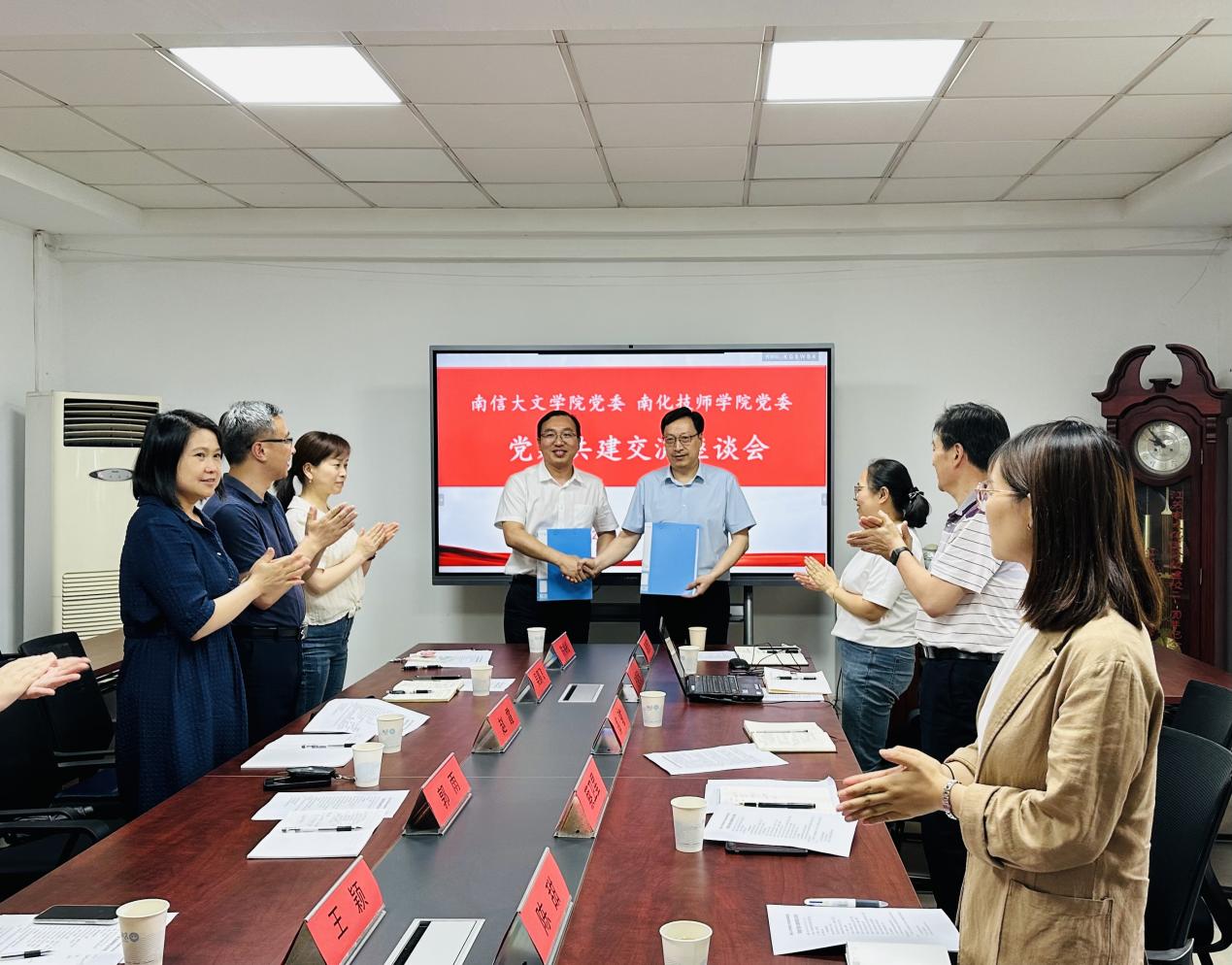 郭雨介绍了南信大文学院的党建工作情况,围绕建立“学习型、改革型、开放型、实干型、廉洁型”五型党组织进行了简要介绍和经验分享。他表示,南信大文学始终坚持以高质量党建引领学院高质量发展,以“五型”党组织为建设目标,扎实推进学院党建工作走深走实。赵霞院长在总结讲话时表示,本次党建共建交流活动,深化了两单位的合作,建立了良好的沟通机制,为双方未来全方位开展合作搭建了交流平台,希望以党建共建为契机,推动双方事业高质量发展,形成互利共赢、共同发展的局面。随后,双方签署了党建共建协议并合影留念。