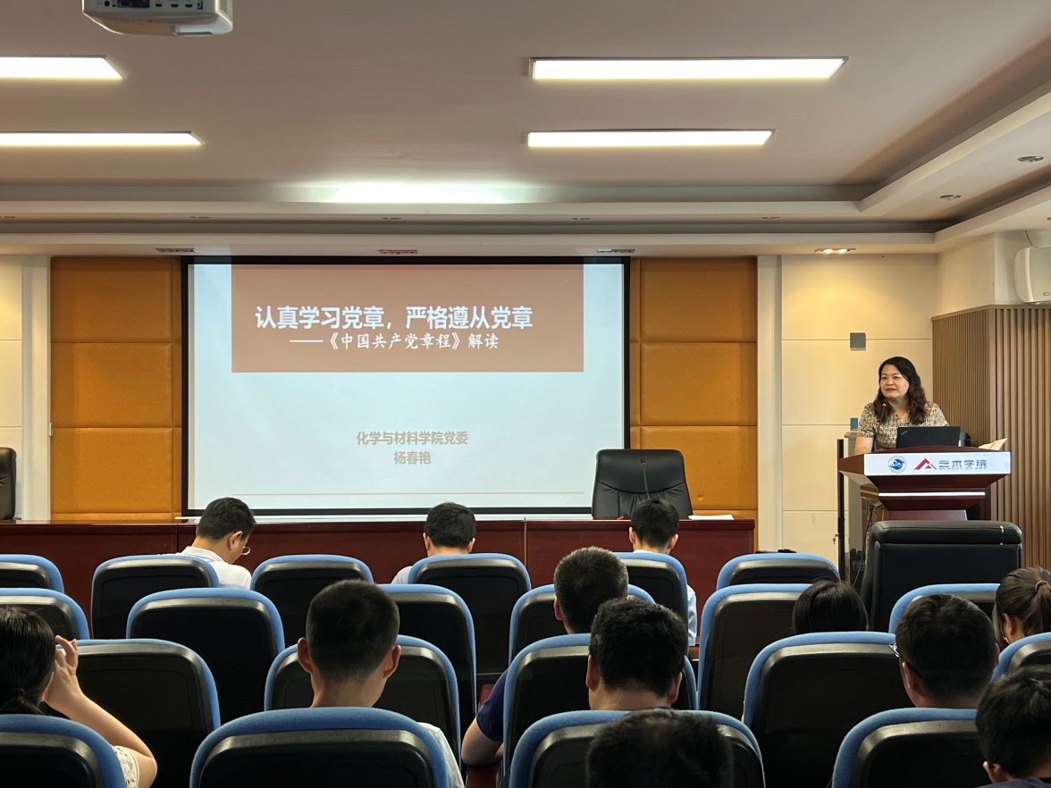 为持续深入开展学习贯彻习近平新时代中国特色社会主义思想主题教育,6月15日上午,化学与材料学院党委在逸夫楼S427会议室召开党员大会,党委书记杨春艳作“认真学习党章,严格遵从党章”——《中国共产党章程》解读专题党课报告,学院全体党员教师与2020级党员研究生参加会议,会议由杨春艳主持。
