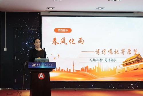 分享结束后,班主任陈涛总结并寄语同学们。她指出,作为青年大学生,处在瞬息万变的时代,要有开放的国际视野和足够的心理准备去迎接世界的变化;青年强则国强,青年大学生身上肩负祖国未来发展的重任,更应该时刻准备着,做合格的接班人。陈涛部长嘱咐同学们,作为准大四生,这个暑假是本科阶段非常重要的时间节点,她鼓励大家尽早确立好自己的未来发展方向和目标,并用实际行动努力追求属于自己的美好的未来,做有理想、有担当、能吃苦、肯奋斗的新时代好青年。