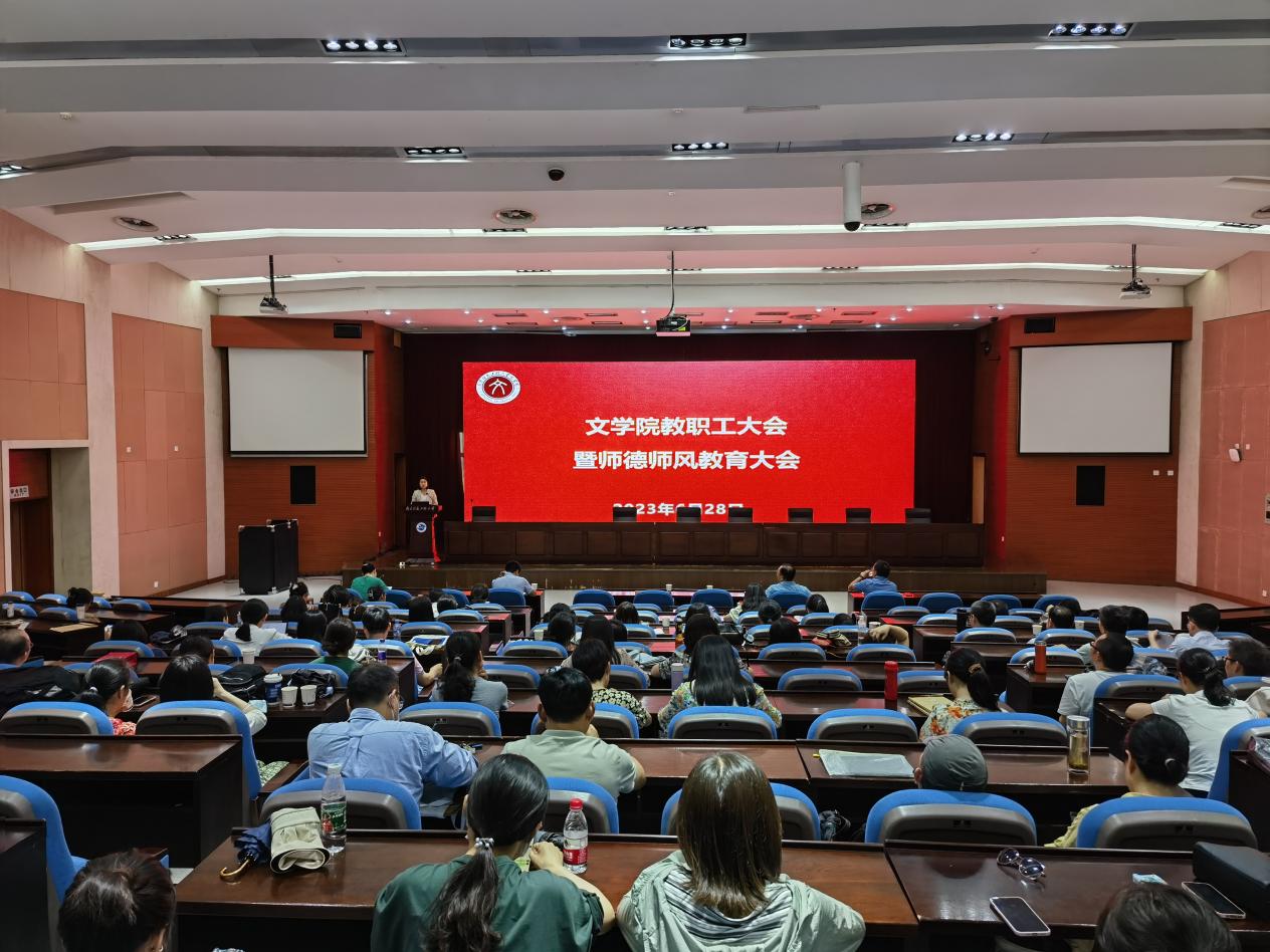 为进一步加强学院师德师风建设和教育,引导广大教师进一步潜心教书育人,文学院于6月29日下午在气象楼报告厅召开全体教职工大会暨师德师风教育大会。文学院全体院领导和全体教职工参加会议,会议由院长赵霞主持。