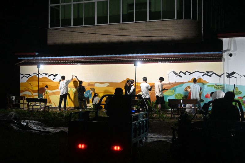 创作的第二天,团队成员早晨不到7点就到达墙绘地点,不惧骄阳开始了连续4个小时的绘画。考虑到第二天有暴雨,团队决定当晚加班绘制。夜幕下的创作尤为艰苦,但蚊虫猖獗的环境并没有让同学们停下脚步。村民称赞道,“这么多蚊虫,我们都怕,南信大学子硬核担当,啥都不怕!”第三天暴雨过后,同学们踏着泥泞,冒着小雨继续创作,只为呈现最美的艺术效果。