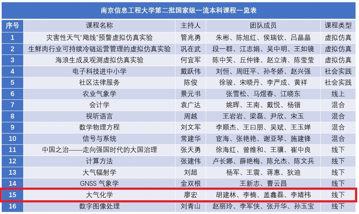 南京信息工程大学环境科学与工程学院于2006年起开设“大气化学”课程,历经了18学年的沉淀与发展,课程内容逐步优化扩展,教学团队逐步发展壮大。现已建立由国家“杰青”牵头的20人教学团队(正高8人,副高11人,中级1人),团队成员有丰富的海外经历,研究领域覆盖大气化学的各个方面。
