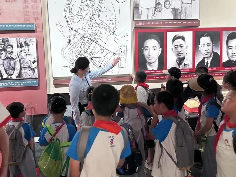 7月12日,为进一步加强青年一代的政治思想教育,培养学生爱党、爱国、爱社会主义的情感,提升社会责任感和社会实践能力,龙袍街道社区工作人员联合志愿者们,在支教过程中结合红色教育内容,为支教点的孩子们开展“文博之夏”公益夏令营活动和“红领巾寻访伟大成就——六合区少先队社会实践活动”,活动以“保护历史文物 守护美好生活 ”为主题,希望青少年通过参观文博场馆,学习文物保护知识,进一步了解南京丰富的文化遗产。第一站同学们来到渡江胜利纪念馆。渡江胜利纪念馆是国家一级博物馆,江苏省爱国主义教育基地、江苏省党性教育示范基地、江苏省党史教育基地、南京市青少年思想教育基地、全国首批百家红色旅游经典景区、南京市“十大红色文化地标”。从展厅陈列的文物、照片与文字中,同学们深入了解了革命先辈的英雄事迹,了解渡江战役的历史意义,立志要坚定理想信念、传承红色基因。