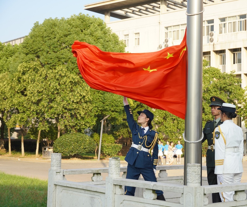 国旗护卫队方阵整齐划一,迈着铿锵有力的步伐,护送着五星红旗走向旗杆。随着《义勇军进行曲》奏响,国旗冉冉升起,现场全体肃立,齐唱国歌。