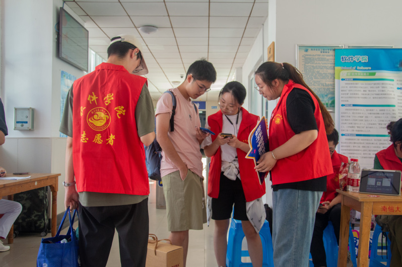 志愿者们用实际行动践行着奉献、友爱、互助、进步的志愿服务精神,他们提前了解萌新诉求,提前做好一系列的准备工作。在迎新现场,志愿者们各司其职,井然有序,为了缓解新生的紧张情绪,志愿者们化身知心哥哥和知心姐姐,引导萌新办理报道入住,帮助萌新搬运行李,向萌新分享校园生活经验和学习方法,为他们提供心理上的支持和鼓励。我院研究生会还贴心为萌新准备了明信片打卡,鼓励新生熟悉校园,了解校园的标志性建筑,增强爱校荣校意识。从清晨的阳光初上,到午后的微醺阳光,再到日暮的点点微凉,志愿者们用最真诚的笑容和最周到的服务诠释着软件学院的热情与担当,为2023级萌新展示了一道靓丽的风景线,得到了家长和萌新的点赞和肯定。