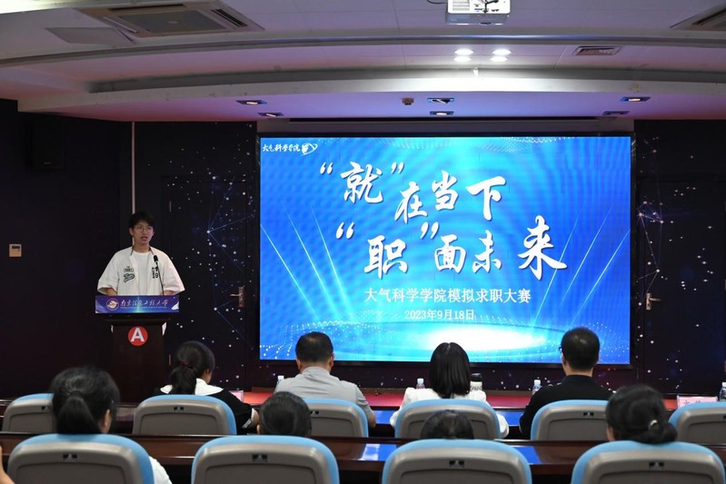 为帮助学生了解求职应聘的流程,促进气象学子对职业的认知和把握,引导学生尽早做好职业发展规划,提升学生求职的综合竞争能力,9月18日晚,大气院在培训楼C101教室举办“‘就’在当下,‘职’面未来”模拟求职大赛。大气院党委副书记、副院长张皓,校学生工作处就业办公室主任张莹瑞,环境科学与工程学院学办主任张龙华,大气院学办主任赵魏丹,大气院团委书记高慧颖及毕业班辅导员老师们出席此次活动,王紫旭担任大赛主持人。