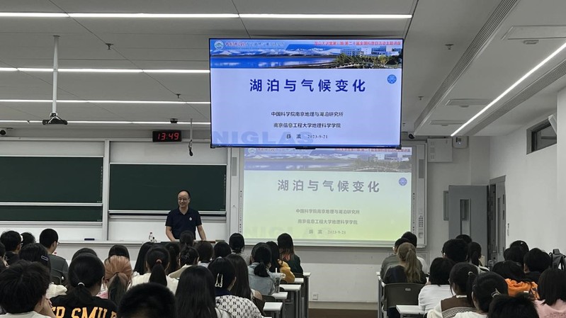 活动伊始,刘红梅首先热情欢迎了薛滨老师的到来,向同学们简要介绍了薛滨老师,并为同学们讲解了全国科普日活动的主旨与意义,勉励同学们为高水平科技自立自强贡献力量。随后,薛滨以“湖泊与气候变化”为主题,为同学们普及有关湖泊与气候的相关科学知识。讲座的主要内容分为“气候变化与湖泊生态系统”“中国的研究实例介绍”和“未来展望”三个方面,以气候变化对湖泊生态环境的影响为着眼点,结合研究实例,分析了湖泊生态环境变化的原因、现状与后果,并针对湖泊生态问题提出了可能的解决方案与未来展望。薛滨以严谨的科学精神、诚挚的科学热情丰富了同学们的科学知识,提升了同学们的环保意识,并激励同学们为气象科普发出自己的声音。