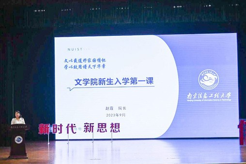活动在雄伟庄严的国歌声中拉开序幕。赵霞院长为新同学讲授入学第一课。她首先代表文学院全体师生向通过十年寒窗、披荆斩棘考入文学院的250名本科生、82名研究生表示最热烈的欢迎和诚挚的祝贺。她说,当前正处在一个充满机遇和挑战的时代,同学们要迎着时代的浪潮,趁势而上,肩负起国家社会赋予的使命。她向学生提出三点希望。一是要胸怀家国天下,树立远大理想。将当下所学瞄准未来所需,为强国建设、民族复兴作出应有贡献。二是要勤学善思笃行,练就过硬本领。三是要养成良好品质,追求行稳致远。最后她祝愿每位同学不负青春韶华,人人成为国家社会有用的栋梁之才,学院将竭尽全力,栽培和助推同学们的成长发展。