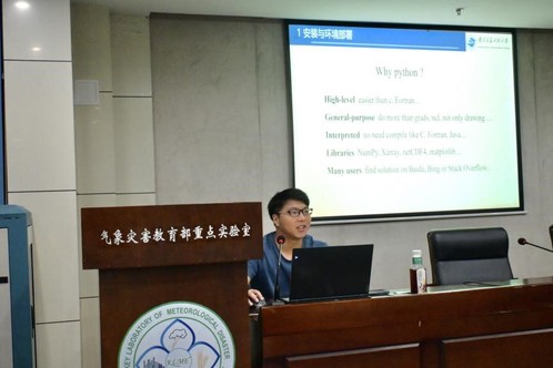 博士研究生郑鸿以《Python基础及其在中尺度数值预报模式中的应用》为题展开报告。他首先从Python的安装部署入手,详细介绍了软件配置、常用模块安装的操作步骤和使用心得,并通过实际操作演示和气象实例分析帮助同学们更好地理解Python在气象科研中的应用。