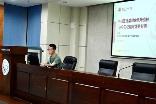 硕士研究生董越作了《内核区增湿对台风米克拉(2020)快速增强的影响》的报告。他首先介绍了台风米克拉的天气尺度背景及环境影响,提出“为什么对台风米克拉的预报严重低估了其发展和影响”的问题。随后,他从数值模拟、诊断分析等方面详细介绍了研究思路,并通过丰富的图文向同学们详细展示了研究成果,给予同学们很大的启发。