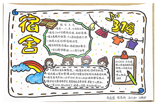宿舍文明公约的制定要求涵盖学习目标、宿舍值日安排、清洁卫生规划和作息时间等重要事项。经过前期的宣传动员,各位同学积极响应,开动脑筋,共同协商,发挥自己的特长,从公约制定、美工设计到成果展示,宿舍成员间相互探讨、分工合作,最终形成共同遵守的“宿舍公约”。