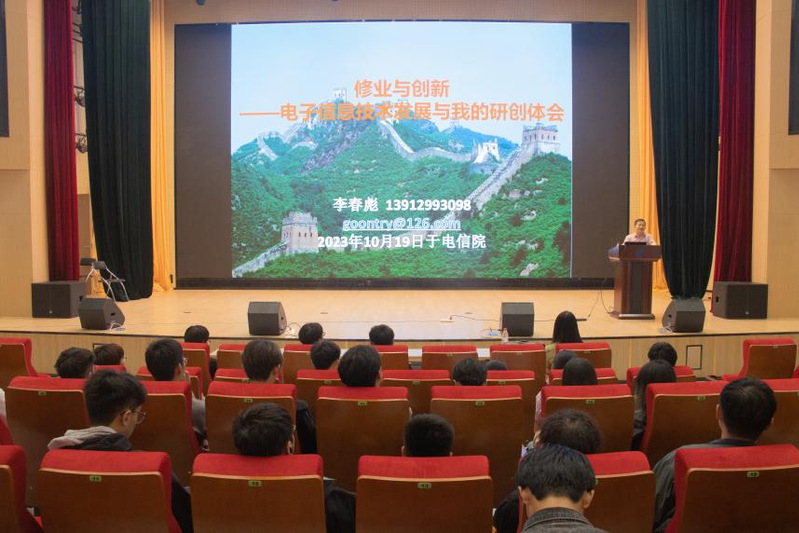 李春彪教授从电子信息领域的发展趋势分析、大学学习的主要任务以及对策、了解领域技术方向与个人兴趣偏好、研创冲动与实战四个方面做详细阐述,引导同学们争做能够高效自我管理的大学生。电子信息行业领域正朝着集成化、智能化的趋势发展,国际国内竞争与协作共存,但协作多于竞争。李春彪教授倡导同学们要以品行为基础、以素养为目标、以能力为媒介,不断提升、不断跨越,止于至善,做一个不断进取和自我完善的人。其次,李春彪教授从创新一条龙、创新五载体、创新两出口、创新三步曲四个方面讲述研创要从现在开始,并介绍了创新法则,鼓励学生们自主进行研创。最后,李春彪教授强调,要做一个能高效自我管理的大学生,需要有良好的时间管理能力、心态管理能力和人际交往能力,并向同学们推荐了PPT管理法(Project、Plan、Target),以增强自我管理能力。同时,李春彪教授鼓励学生要选择合适的导师,尽早加入团队开展研创。