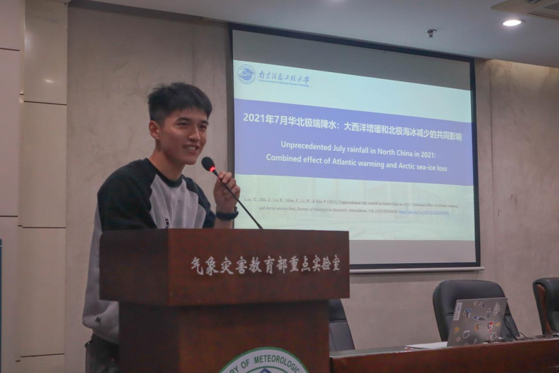 刘雪峰做了题为《2021年7月华北极端降水:大西洋增暖和北极海冰减少的共同影响》的报告,他首先介绍了如何寻找影响2021年7月华北极端降水的主要物理因子,详细阐述了大西洋暖海温以及北极海冰减少对华北极端降水的物理机制,并通过数值模拟对研究结果进行了验证。接着,他通过丰富的图文向同学们详细展示了自己的研究成果,为同学们树立了榜样,给予同学们很大的启发。
