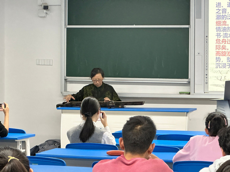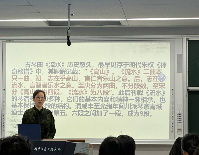 最后,张丽娟为同学们播放《流水》一曲,琴声悠悠,时而缭绕飘忽;时而波澜不惊;时而跌宕雄壮……带领同学们重新领悟伯牙与钟子期的故事,体会古琴之奥妙无穷,沉醉其中。
