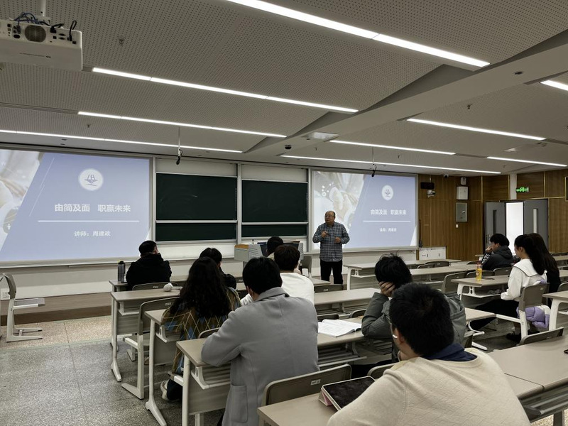 讲座伊始,周建政结合个人经历以及现阶段就业现状向大家强调了职业生涯规划的重要性,他为同学们讲述了今年招聘会的几大新特点:包括出现的新产业、新赛道、新岗位;招聘专业的转变;重视实习经验;AIGC新兴等。随后,周老师从岗位需求以及清晰程度上告诉了参会同学如何清晰了解职位要求,并以一份招聘简章为例为大家分析了企业想要招聘什么样的人,由此向大家介绍了现阶段的在线筛选简历机制,包括匹配关键词、定制简历内容、多维度筛选、快速筛选、智能意愿匹配等,并向大家讲述了投递简历时的诸多注意事项。周老师结合个人指导经验,向学生传授了如何精细、准确地制作个人简历,并针对面试过程中的注意事项,提醒大家在不同面试场合中的重要事宜及方法技巧。