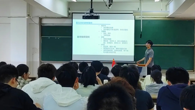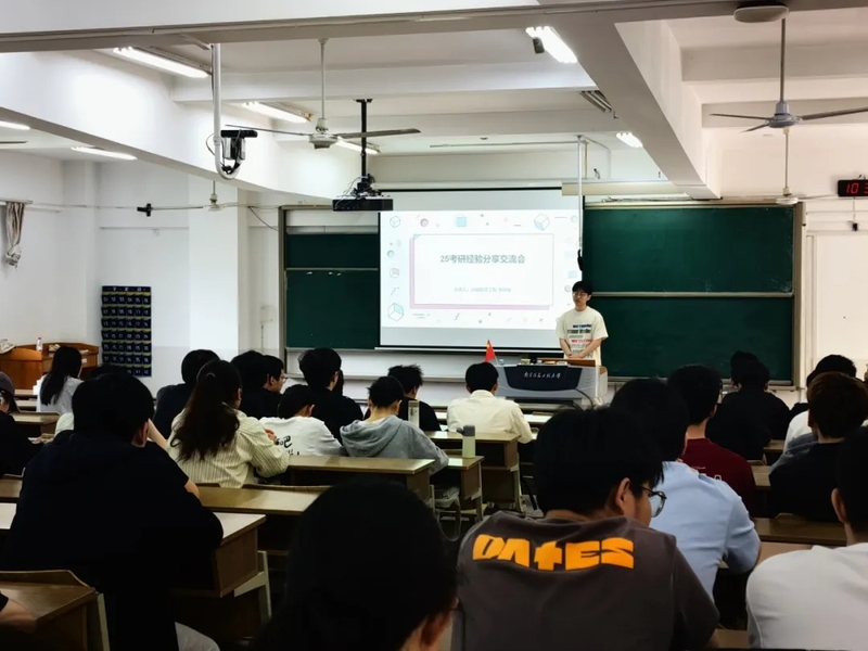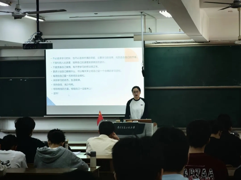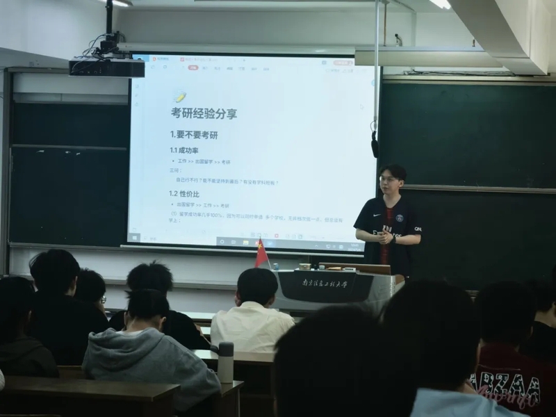 活动伊始,2020级优秀学生代表围绕考研择校、备考复习计划、考研资料推荐、国外学校申请流程和注意事项、心理状态调整等方面详细展开。考研至南京大学的张俊杰学长主要讲述了复习计划和时间安排的重要性。他强调,制定合理的复习计划并严格执行,是保证备考效率的关键。同时,他还分享了各科的高效复习资料,以及如何根据自己的实际情况调整复习策略的方法。考研至南京邮电大学的陆雯婧学姐为大家梳理了考研需要掌握的各个知识点。她详细介绍了各科目的复习要点和技巧,并分享了一些实用的复习方法和资料。陆雯婧学姐还鼓励同学们要多思考、多总结,不断提高自己的综合素质和能力。考研至北京工业大学的李祥瑞学长则着重分析了选择目标院校时的小技巧。他结合自己的经历,详细介绍了如何收集信息、分析数据、对比院校之间的优劣势等方面的内容。李祥瑞学长提醒学弟学妹们,在选择目标院校时,一定要结合自己的实际情况和兴趣爱好,避免盲目跟风。考研至南京信息工程大学的刘世纪学长强调了择校选择的重要性,详细解读了考研的时间点和流程。针对报考本校的学生,刘世纪特别分享了复习策略和经验,为同学们提供了宝贵的备考指导。最后,拿到University of Glasgow 录取通知书的陈祖乐学长分享了自己的国外学校申请流程和相关经验,提醒学弟学妹们,出国留学需要提前做好充分的准备和规划,包括语言学习、申请材料准备等方面的工作。