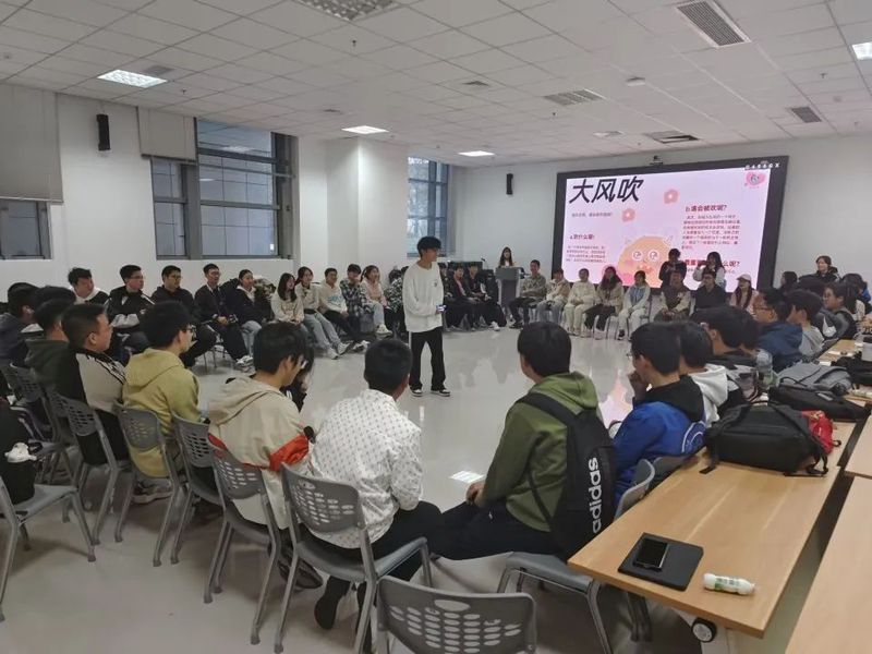 活动以自我介绍开场,大家围坐一圈依次介绍自己的姓名、家乡、特长爱好等,加深彼此的了解。在“大风吹”游戏环节,大家集中精神、认真聆听指令,稍有不慎就会错失椅子,成为唯一一个被留在圆圈中的“倒霉蛋”,这让现场氛围变得愈来愈紧张激烈起来,一轮游戏结束,大家起初的生疏感迅速消失。“你画我猜”和“猜歌大赛”两个游戏以班级为单位划分小组,各班班委相互配合,默契十足,更有同学在猜中歌名后上台一展歌喉,赢得了在场所有人的掌声。最后,大家在“手势舞”环节为自己、为队友、为团队送上鼓励和祝福。