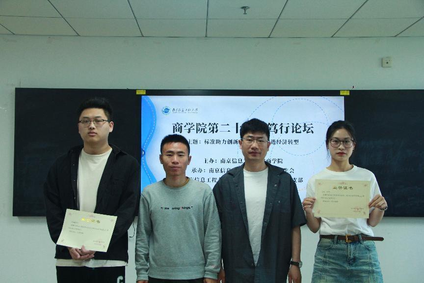 南京信息工程大学第三届学术文化节暨商学院第二十九期笃行论坛于5月16日在阅江楼426顺利举办。本次论坛主题为“标准助力创新发展,绿色促进经济转型”,商学院张明杨副教授和江民星副教授担任本次论坛点评嘉宾。来自工商管理专业的柏冰鑫同学和应用经济学专业的吴雪平同学担任主讲人,学术部韩永成同学担任主持人。本次活动由商学院研究生会、中共南京信息工程大学商学院工商管理研究生支部委员会联合承办。