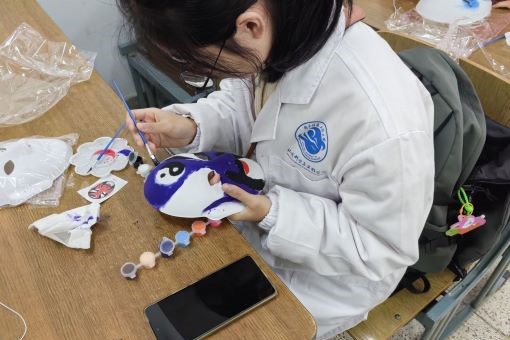 面具是人们内心世界的一个象征,人类面具已有几千年的历史,最早可能用于狩猎活动,为了接近猎物,猎人用面具把自己装扮成各种动物,在民间的一些戏曲表演中,面具是主要的化妆手段。通常面具能反应扮演角色的人格特征。面具DIY让同学们能在绘画过程中相互交流自己的绘画灵感,并积极踊跃的向大家展示绘画作品、作品展示的人格特征和背后的寓意。赵凌岚同学的梅花面具灵感来自“宝剑锋从磨砺出,梅花香自苦寒来”。他说梅花在严寒中盛开,不畏风霜和凌寒傲雪,代表了中华民族自强不息的精神品质。王彦浩同学的蜘蛛侠面具,他说蜘蛛侠代表勇敢、努力和不屈服的品质,象征青春和成长,反映出年轻人在面对压力和困扰时的挣扎。杨哲滔同学的作品灵感来自于京剧脸谱。大片白色为底凸显了人性虚伪的特征,面具中的青色和黑色则表现了人性的固执鲁莽,而位于中轴部位的红色则是人们与生俱来的英勇之气。这幅面具体现了人性的复杂性。现场气氛高涨,同学们饱含热情,积极投入到绘画创作中,并踊跃地展示自己的绘画作品和创作过程。