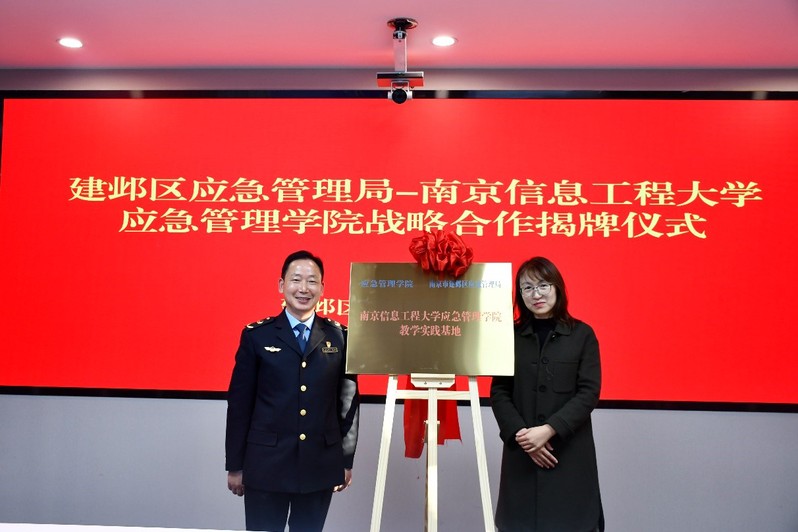 徐海波和李开宾为“应急管理学院-建邺区应急管理局共建应急科普基地”揭牌,顾湘和沈留贞为“南京信息工程大学应急管理学院教学实践基地”揭牌,薛勇为金叔阁颁发南京信息工程大学应急管理学院特聘教授证书,金叔阁为张胜玉颁发建邺区应急管理局全国综合减灾示范社区指导专家证书。