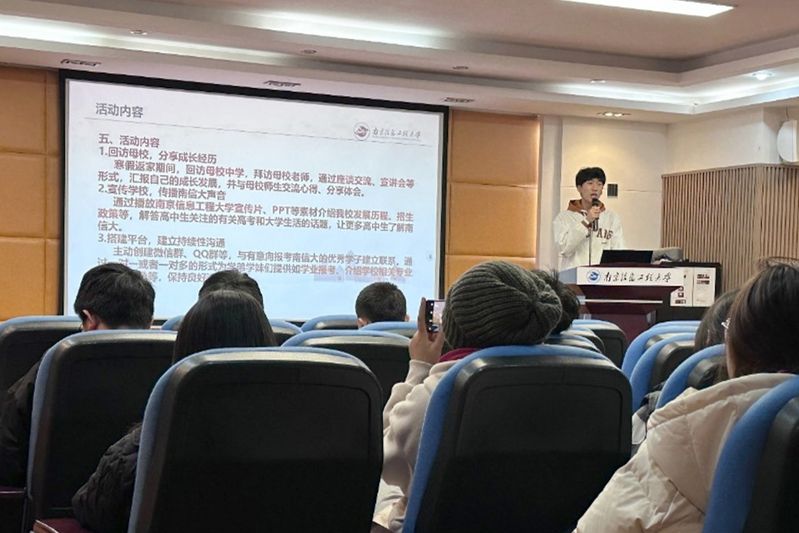 临近尾声,程伟对本次动员会作了总结,他鼓励每一位同学都应树立主人翁意识,真正把自己当作南信大的主人,爱校荣校,努力向每一个人讲好信大故事。各位同学要充分发挥优秀学子的表率作用,促进大学生同母校师生的情感延续,推进高校同高中母校之间的校际合作,不断扩大南信大的社会影响力。