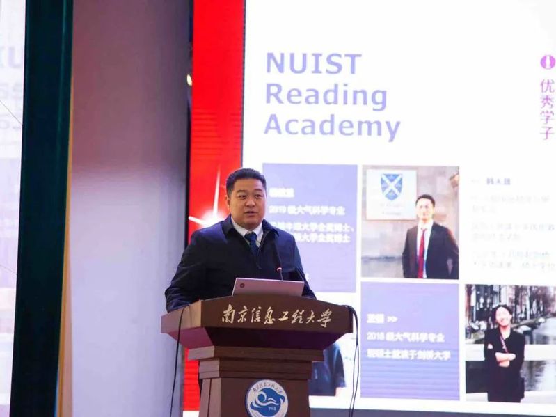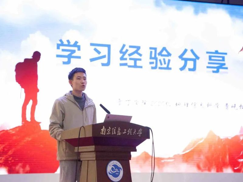 优秀在校生代表、雷丁学院2020级地理信息科学专业曹屹松上台分享自己的学习经验,他根据学生日常学习生活接触的四个维度:专业学习、英语学习、科研竞赛、保研建议进行具体分析。