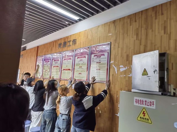 会后,老师和同学们来到逸夫楼5楼开展志愿服务活动,张贴“艺心向党”党团工作展板。同学们耐心地在展板背后贴好双面胶,用双手准确固定住展板在墙面上的位置,力求工整美观,同学们在汗水中体会劳动的快乐,向学校、学院表达感恩之情。学院的“艺心向党”党团工作展板也彰显出学院在党团建设工作的扎实细致,规范标准。
