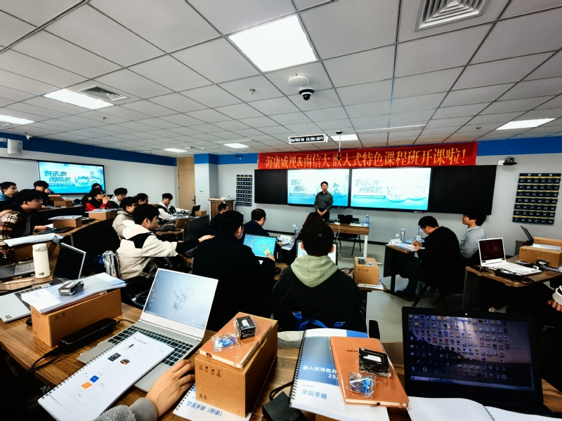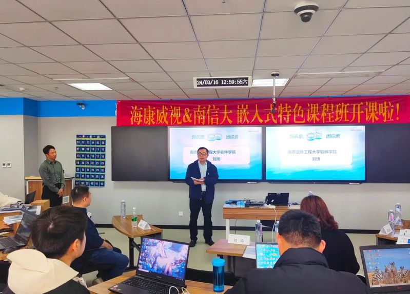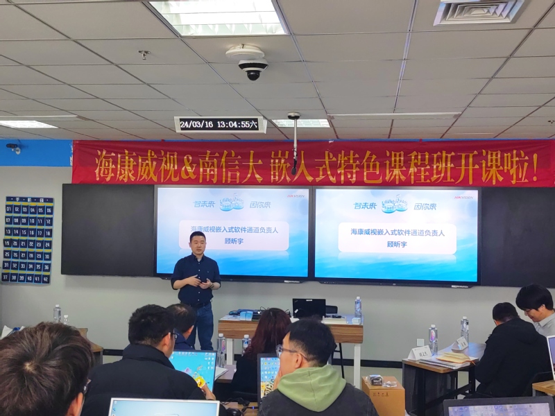 郭星甫进一步就海康威视公司概况和嵌入式特色课程班管理要求展开介绍。在与同学们的互动中,他介绍到,我们正生活在一个物联大爆发的时代,海康威视业务从视频监控、综合安防、以视频为核心的智能物联网解决方案和大数据服务提供商到智能物联,经历了20年的发展历程,目前在智能物联网赛道,海康威视在技术和产品、生产制造、营销服务等各个方面都逐步构建起了适配智能物联碎片化需求的核心能力,今后,海康威视会持续技术创新、丰富产品体系,打造产品技术综合竞争力。此次和南信大联合开设嵌入式特色课程,旨在将理论知识和实操讲解紧密结合,通过企业真实应用案例和实操环节,帮助同学理解从理论知识到企业产业化落地的过程,要求同学们全勤参与,积极互动,通过课程考核,成为优秀学员。