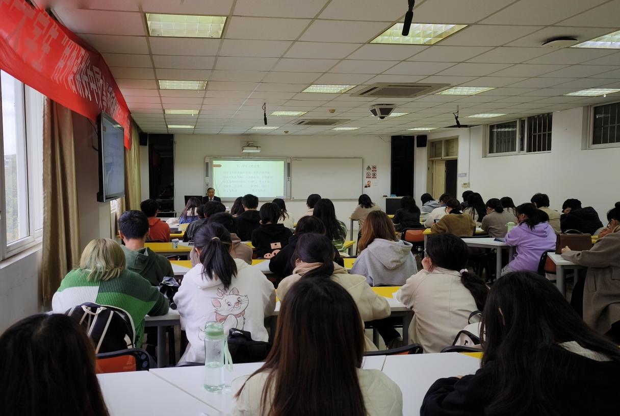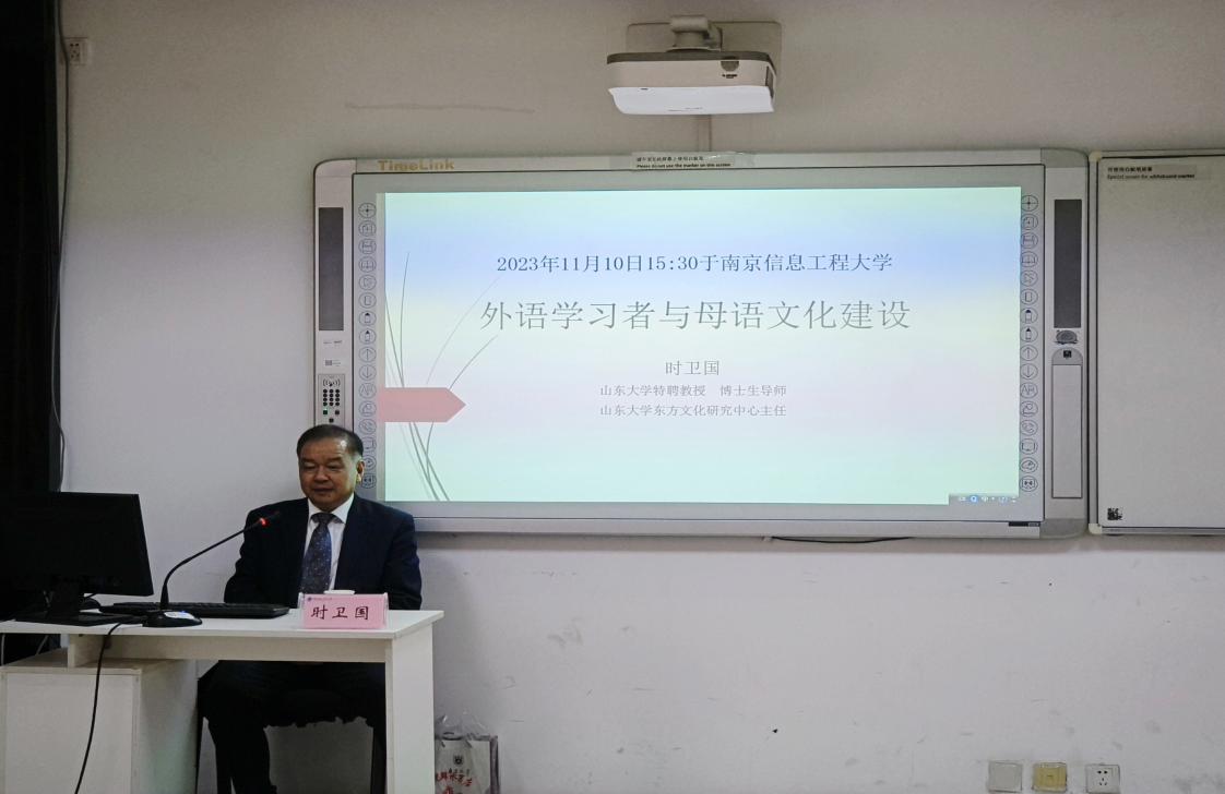 11月10日下午文学院主办的明德·语言文化跨学科高层论坛系列讲座在文德楼C407如期举行。本次活动,特邀山东大学特聘教授、东方文化研究中心主任时卫国教授作题为“外语学习者与母语文化建设”的学术报告。讲座由文学院院长赵霞教授主持,学院部分教师、研究生及本科生参加本次讲座。