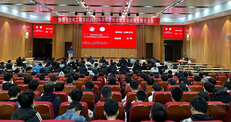 扬帆笃行正当时,砥砺奋进谱华章。为进一步总结学院学风建设工作成效,表彰先进引领示范,凝聚物电家(+)品牌育人合力,持续增强学生对学院的认同感、归属感和荣誉感,2023年11月15日下午,物理与光电工程学院在滨江楼报告厅召开2023年学风建设表彰大会暨新生教育大会。学院副院长(主持工作)涂兵、副院长赖敏、副院长赵德林、副书记兼副院长田智、院长助理杨翠红、学办全体辅导员老师、2023级全体同学及相关获奖学生代表出席会议。会议由学院党委副书记(主持工作)徐志勇主持。