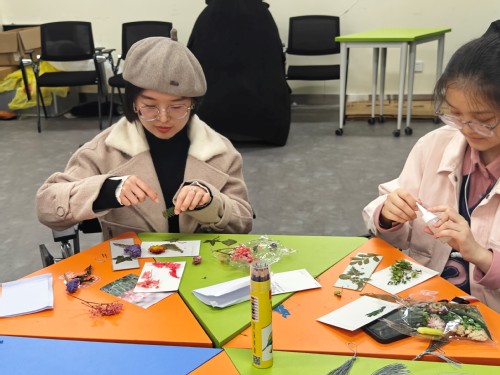 活动开场,秦玄引导大家在书签上写下最近的烦恼或焦虑后互相交换,对彼此的问题作出回应,在大家交流的过程中,她结合心理学专业知识,对于这些烦恼或焦虑进行了分析,同时也向大家传授了自我调节的方法。随后她带领同学们分组进行了“悬空作画”和“stoop大闯关”两个挑战,大家在过程中相互协助、通力合作,在团队交流中深切体会到伙伴的重要性。活动最后,秦玄和大家一起选择自己钟意的花材自制书签,贴在提前准备好的祝福明信片上,送给自己想要鼓励的人。
