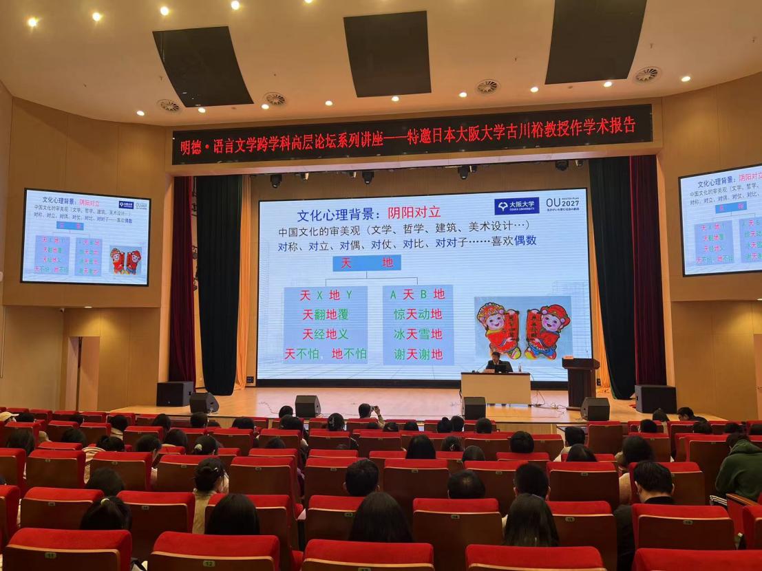 古川裕从生动的语言现象着手,以汉语学习者的视角分析了教材中出现的“对举”实例,引发参会师生的思考。在此基础上,阐述了汉语“对举”形式独特的结构、语法、语义功能,并指出“对举”形式在中国文化中的重要性。古川裕表示,无论是古代还是现代,口语或书面语,汉语普遍采用成对的表述方法。“对举”形式不仅在语言中广泛存在,而且是中国文化包括文学、哲学、美术、建筑等各个方面的核心审美概念。讲座针对学习者习得过程中存在的问题,进一步指出了“对举”形式的特点与难点,并提供了有针对性的教学方案。古川裕表示,尽管日本学习者在学习汉字这门外语方面有一定优势,但他们在理解和运用如“左一件右一件”“里三层外三层”等“对举”表达时,同样缺乏汉语特有的语感和应用能力。因此,建议在教学活动中应更多地关注这类表述方法,从“对举”形式的“结构特点”“句法特点”“语义特点”着手强化教学效果。