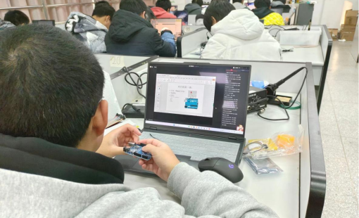 首先由主讲人为同学们介绍本次课程中最重要的元器件——单片机。单片机又称单片微控制器,它不是完成某一个逻辑功能的芯片,而是把一个计算机系统集成到一个芯片上,相当于一个微型的计算机,和计算机相比,单片机只缺少了I/O设备。概括的讲:一块芯片成就了一台计算机。它的体积小、质量轻、价格便宜,为学习、应用和开发提供了便利条件。同时,学习使用单片机是了解计算机原理与结构的最佳选择。同学们跟随主讲人的指导学习了点灯代码,这一串小小的代码是决定灯泡能正常发光的关键。其次同学们学习了开关的基本电路原理图,并认识了开关中所用到的材料,通过对基本原理的学习,同学们更透彻地掌握了操作步骤。接着同学们又学习了按键代码、串口数据、声音传感器代码、配套软件。