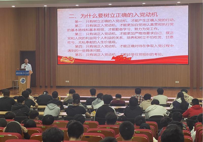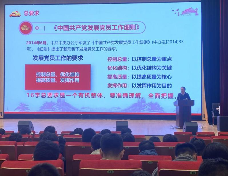 刘雨华主要解读了《中国共产党发展党员工作细则》,他强调做好发展党员工作,要紧紧围绕“控制总量、优化结构、提高质量、发挥作用”这十六个字的发展党员工作总体要求,牢牢把握保证质量这个核心,始终把政治标准放在首位,切实把好发展党员质量关。随后,他为同学们详细介绍了党员发展的基本流程,并结合实际工作经验图文并茂地为同学们讲解了党员发展的程序。他希望同学们认真把握党员发展流程,进一步端正入党动机,明确奋斗目标,对标榜样力量,时刻以一名党员的标准严格要求自己,着力提高政治素养和综合素质,争取早日加入党组织。