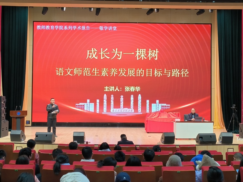 冬日专家精心指导话素养,师院学子用心倾听明方向。为提升语文师范生专业素养,了解一线教育动态,明晰未来职业发展道路,12月3日下午,教师院第22期“敬学讲堂”在信息科技大楼D区报告厅开讲。无锡市教育科学研究院副院长张春华以《成长为一棵树——语文师范生素养发展的目标与路径》为题作报告。21、22级汉语言师范专业全体同学以及部分语文学科教育硕士生聆听讲座,课程与教学系系主任汲安庆老师出席,方超群老师主持并作报告。