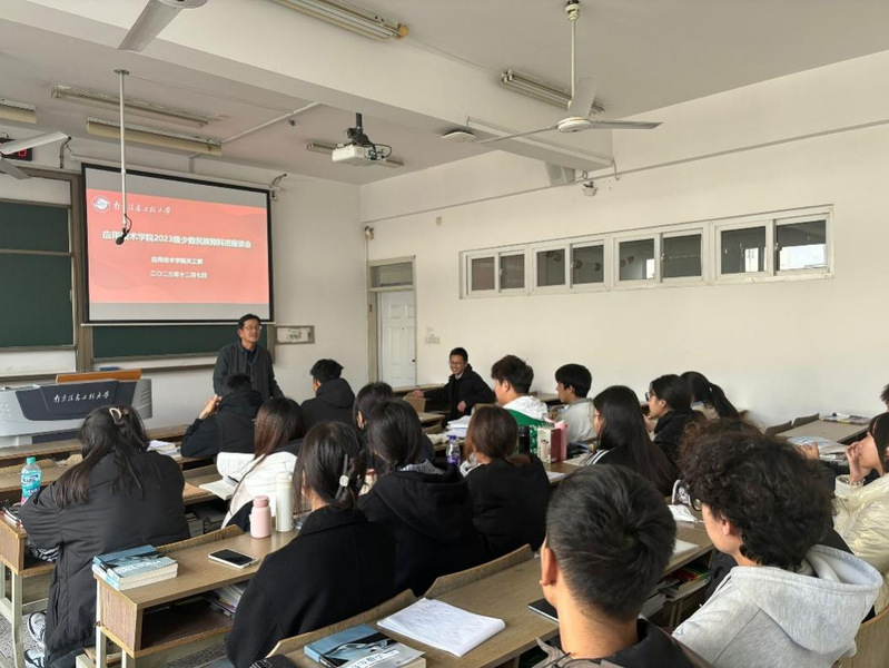 为进一步深入了解少数民族预科学生的学习、思想、生活状况,发挥学院关工委在大学生思想政治工作中的积极作用,近日,应用技术学院关工委在滨江楼S504教室召开少数民族预科生座谈会。院关工委常务副主任刘寿东、院党委副书记卢愿清及2023级少数民族预科班全体学生参加了本次会议。