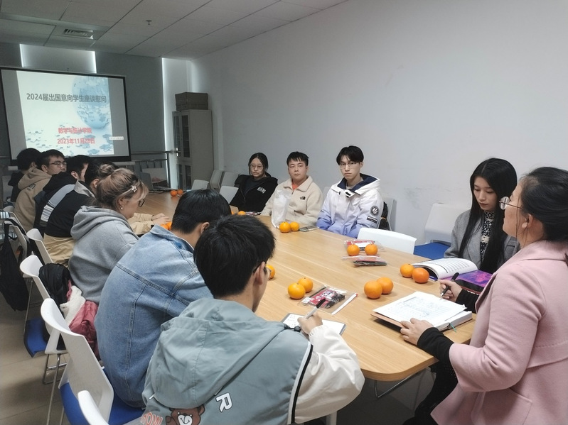 活动伊始,毕业班辅导员靳蕊卉介绍了举办本次活动的目的和意义,传达了学院领导对出国留学意向学生的殷切关心和期望,并为同学们送上学院精心准备的学习用品和水果。参会学生就意向留学国家、目标专业、递交材料等方面介绍了自己当前的进展情况及准备过程中遇到的困难。针对每位同学的疑惑,马老师一一进行了指导,并提出针对性的建议和解决办法。四位学长通过提前录制的视频,结合自身的经历,从出国留学申请流程、学校专业选择、不同国家的消费情况及对学业成绩、实习科研、语言证书的要求等方面给学弟学妹提出中肯建议。他们向学弟学妹们强调“成绩是第一位的”,要结合自己的兴趣爱好、职业发展、家庭情况等制定合理的留学计划。经过本次愉快而有效的交流,同学们均表示在此次活动中受益良多。