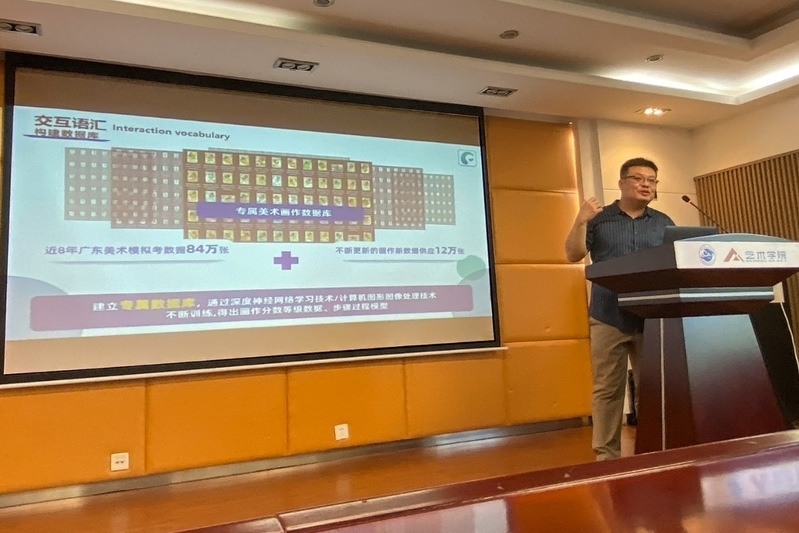 首先,纪毅介绍了AI的概念与背景,包括AI通过算法模拟仿真人类智能的能力,以及AI艺术所具备的作为交叉学科的特点。随后,纪毅与在座的老师和同学们讨论交流了有关创造AI艺术作品的关键元素是什么及如何利用AI技术创建一种自然、直观的交互方式进行个性化交互模式的问题,收获了在座老师与同学们的积极反馈。接着,他指出,人、交互作品及场景与AI技术是创造AI艺术作品的关键元素,而语言是构建相互互动的关键因素;并向大家介绍了包含交互词汇、交互语法及交互语义的个性化交互设计语言。