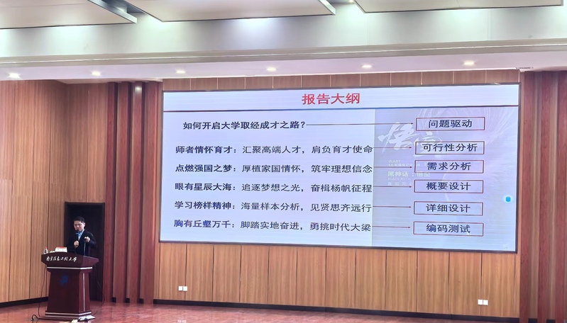 许小龙以热门话题“黑神话”为切入口,幽默风趣地运用“取经”这一经典故事线,从师者情怀育才、点燃强国梦想等多个维度,为同学们全面剖析了大学生涯的“取经成才之路”。他从自身的大学生活经历出发,结合多位获得国家奖学金的优秀学长学姐的励志故事,通过样本分析的思维方式,向学生们展示了职业规划的重要性。他还与同学们分享了带领学生参加学科竞赛的宝贵经验,鼓励同学们心怀梦想,勇于尝试,追求卓越。他强调,踏上“取经”之路,勇敢地面对挑战与困难,比最终抵达“灵山”更为重要,鼓励同学们能够谨记“明德格物,立己达人”的校训,珍惜大学时光,不负青春韶华。