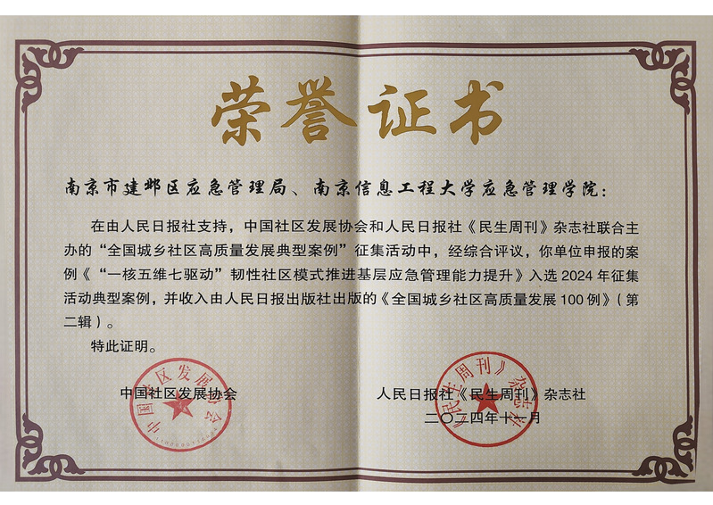 为推进基层治理体系和治理能力现代化建设,推动全国城乡社区高质量发展,由中国社区发展协会、人民日报社《民生周刊》杂志社联合举办的2024年全国城乡社区高质量发展典型案例征集活动,自2023年12月征集以来,得到了全国各地热烈响应,共收到1200余个推荐案例。近日,经过专家评议,南京信息工程大学应急管理学院与南京市建邺区应急管理局联合报送的《“一核五维七驱动”韧性社区模式推进基层应急管理能力提升》成功入选2024全国城乡社区高质量发展典型案例。