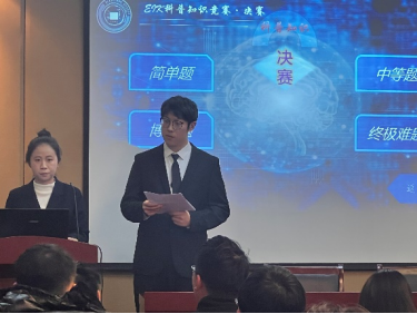 由主持人宣读完比赛规则后,比赛正式开始。比赛分为三轮:初赛、半决赛、决赛。题目均为抢答。初赛阶段,简单题、中等题、难题轮番上阵,不论题目难易,总有些队伍第一个抢答、而另一些队伍则选择思考过后伺机而动。经过残酷淘汰后、6支队伍遗憾出局、剩下9支队伍随机分成三组、每组三队,开始了三进一的半决赛。此时、为了缓和比赛紧张情绪、达到科普效果、主持人会穿插讲解赛题中所提到的最新技术、最新概念,不论比赛成败与否、相信每一位参与者都必然收获颇丰。半决赛结束,8、10、14班成功晋级。决赛题目分为:简单题、中等题、博弈题,规则创新多变、不仅考察了选手们日常的科学知识储备、更考验出了选手们的临场应变能力,是选择简单题步步为营?还是博弈题一招定胜负?没有正确答案、但有最终赢家。最终10班姜承志、何恩琦、李明智三位同学获得比赛胜利,获得最终冠军。