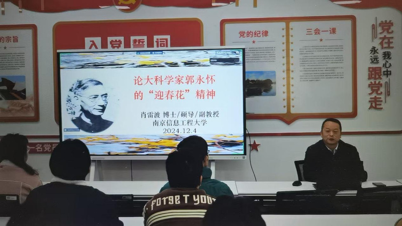 12月4日,电信院第三十六期“北斗讲坛”在西苑社区红色驿站顺利举行,此次讲座邀请南京信息工程大学马克思主义学院肖雷波副教授作为主讲人,讲座主题为“论大科学家郭永怀的“迎春花”精神”。电信院100名同学线上线下参加了报告会,报告会由辅导员胡志红主持。