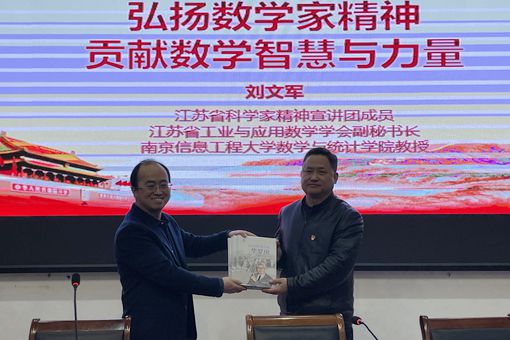 活动中,刘文军代表数统院向高邮一中赠送《共和国的数学家》全套书籍,并授牌共建 “数学文化科普教育基地”。刘文军在高邮一中报告厅面向高一学生作《弘扬数学家精神,贡献数学智慧与力量》主题报告。他用贴近中学生生活实际的案例、生动直观的微视频和好玩有趣的“手指夹纸”游戏,深入浅出地向同学们科普了学习数学的意义。通过祖冲之、华罗庚、苏步青、陈景润等家喻户晓的数学家故事,娓娓道出数学的精神内涵和价值;通过分析国内AI人工智能五大“卡脖”痛点,让学生了解了数学模型在医学、体育、音乐等各个领域的作用及当代青年肩负的使命和责任,引发同学们共鸣,点燃了他们的科学热情。