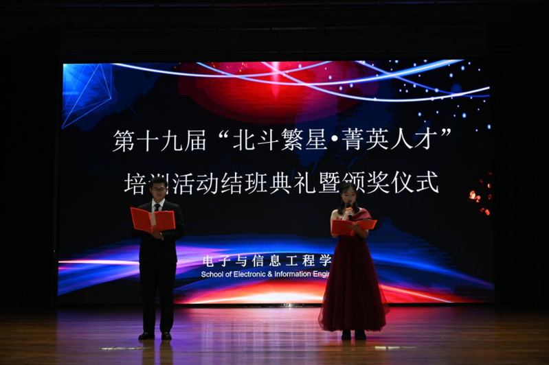 为表彰先进,激励电信学子成长为有理想、有信念、有目标、有担当的新时代青年,12月24日晚,电子与信息工程学院在大学生活动中心二楼小剧场举办了第十九届“北斗繁星·菁英人才”培训活动结班典礼暨颁奖仪式。本次大会由陈雨杨、张欣怡主持,电信院学办副主任黄开洁、分团委书记祁雪峰,辅导员胡志红、张为东、贾桓以及团学组织300余名学生代表出席了本次大会。