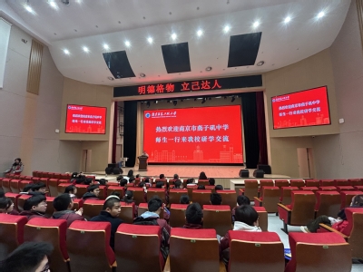 随后师生们齐聚临江楼报告厅,参加实践交流报告会,报告会由关颖婧主持。沈义贞向燕子矶中学的师生们表达了最诚挚的欢迎,希望同学们通过此次实践之旅能够走进科学,了解大气科学等学科,他表示同学们在学习时既要脚踏实地,也要仰望星空,注重提升艺术素养,并诚邀同学们高考后报考我校,围绕科学发明、艺术创造选择专业,铸就美好未来。