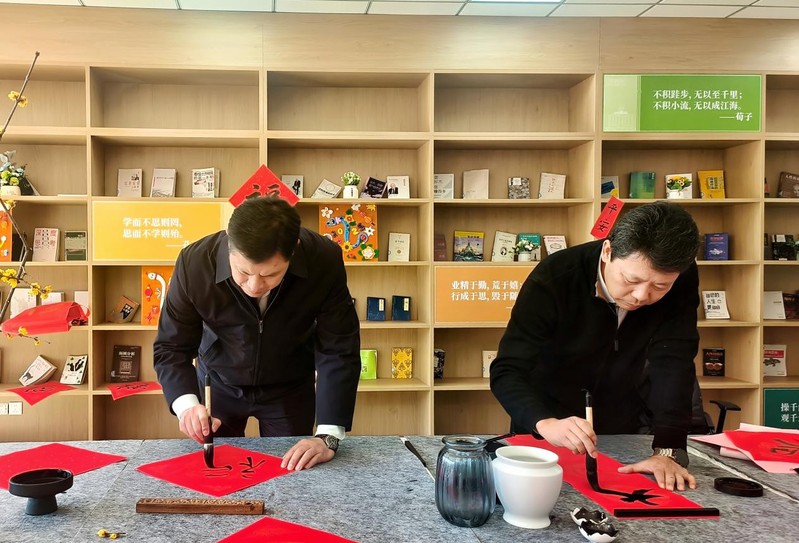为弘扬中华民族传统文化,增强一站式社区文化育人功能,迎接农历乙巳蛇年的到来,营造喜迎新春氛围,1月17日,大气院在晖园社区举办“墨香四溢迎新春情暖社区送祝福”手写春联活动,校长陈海山,纪委书记周乃贵,副校长韦忠平、金自康、朱大梅亲临现场。