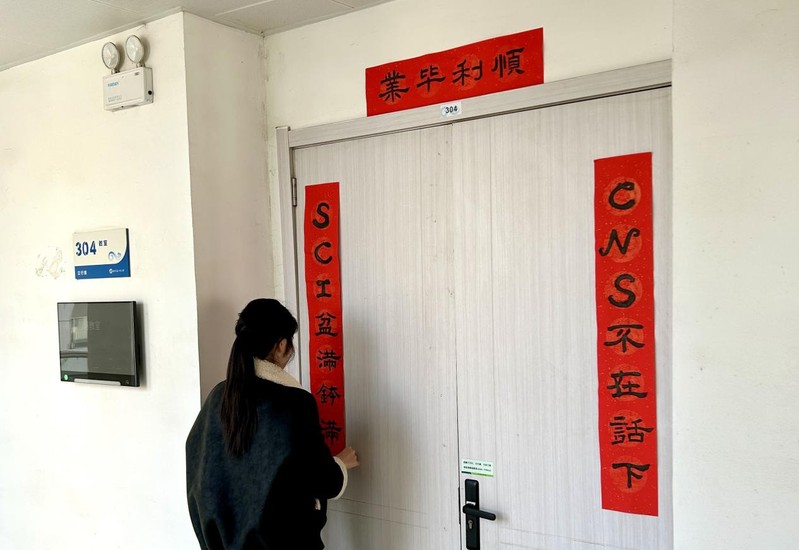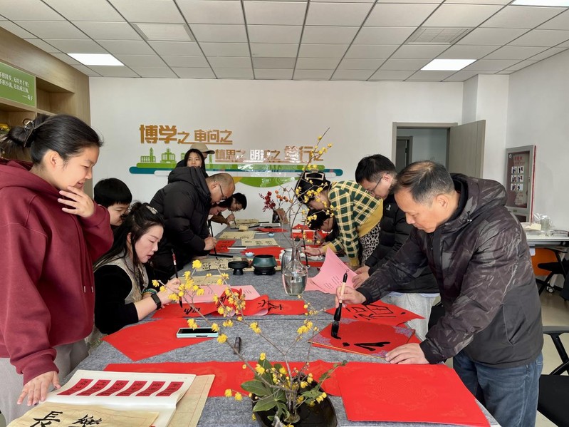 楷书端正秀丽,行书行云流水,隶书古朴厚重,各种字体在大家的笔下熠熠生辉,活动整个过程以春联作为载体,展示出师生们对校园的热爱,抒发了南信大人努力奋进的豪情,表达了学子们乐观向上的生活态度。现场墨香四溢,气氛热烈,活动吸引了全校众多师生前来社区参与,活动结束后,一幅幅饱含着师生们美好祝愿的春联及斗方被张贴在晖园社区的每一扇玻璃门上,它们不仅为社区门庭添彩,更传递了温暖关怀,让大家提前感受到了新春的欢乐与温馨。