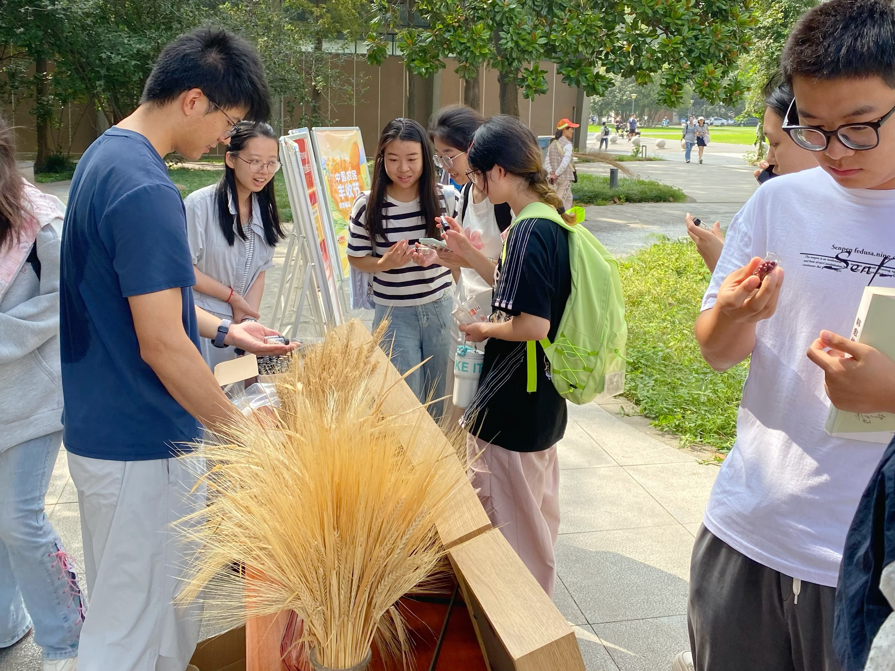 23日,正值秋分时节和第八个中国农民丰收节,南京信息工程大学生态与应用气象学院在校园内开展了以“庆丰收、促和美”为主题的中国农民丰收节宣传活动。通过设置主题展板、实物展示与现场讲解等多种形式,向校内师生生动展现了我国农业农村发展历程与辉煌成就。主题展板以图文并茂的方式系统梳理了国家三农政策演变、农业现代化进展及乡村振兴战略成果,现场还陈列了来自全国多地的典型土壤标本以及小麦、水稻、玉米等50余种作物标本。大学生志愿者热情投入讲解,帮助更多人理解农业与气象、环境、信息技术等多学科的交叉应用。